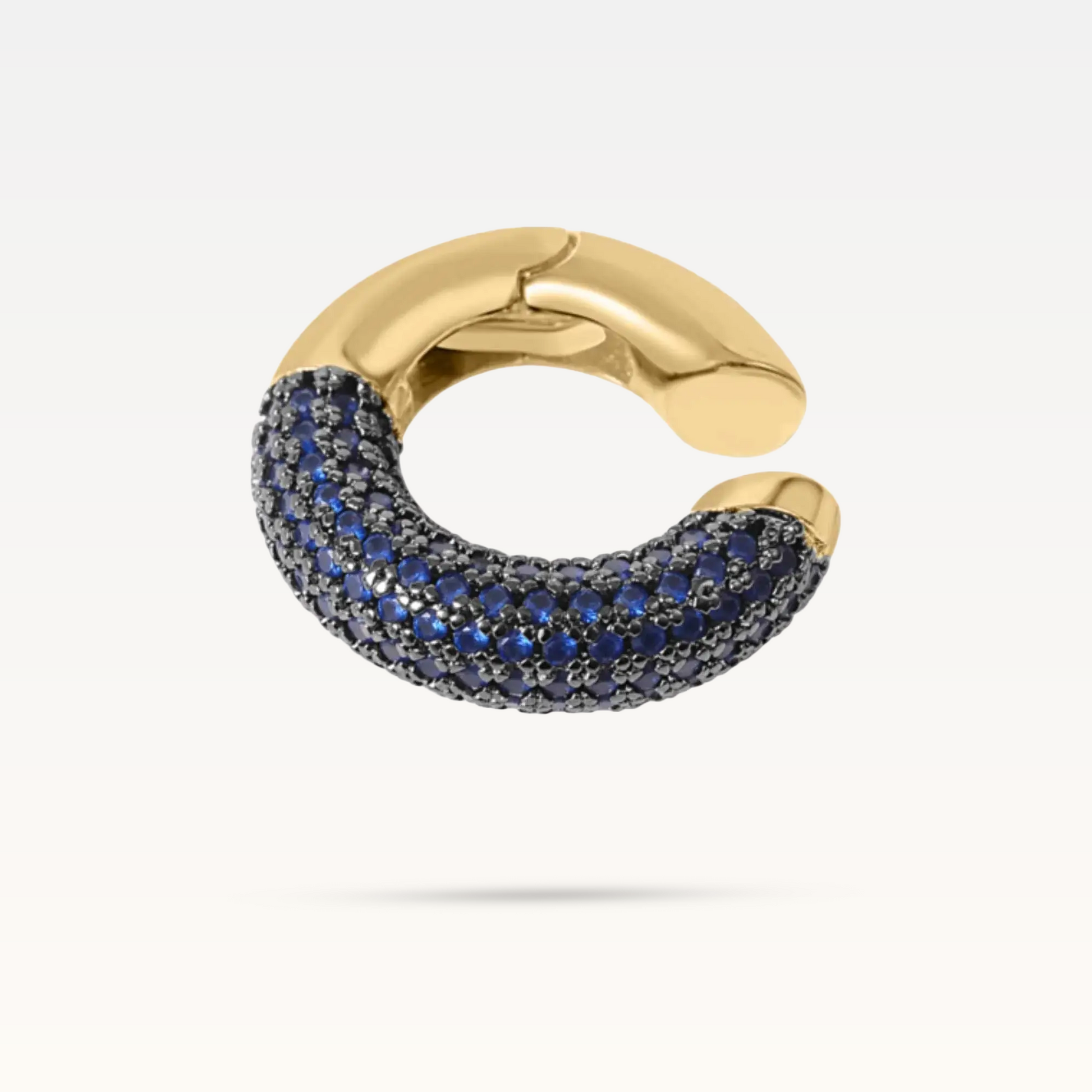Indulge in elegance with Margot Bardot's Alba Ear Cuff - Blue, designed for those who cherish simplicity and sophistication. Fashioned from nickel-free 925 gold plated sterling silver and adorned with pavé black zirconias, this ear cuff boasts delicate curves that exude charm.