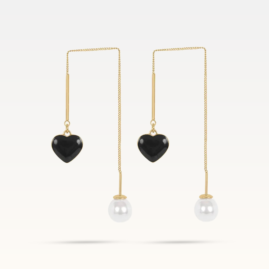 Crafted from nickel-free 14k gold plated metal adorned with black colored enamel and simulated pearls, they measure 10.8cm and weigh a light 3.5g per pair, ensuring comfortable wear. Secured with a traditional pin anchoring system, these earrings are perfect for adding a touch of romance to your everyday outfits or special occasions.