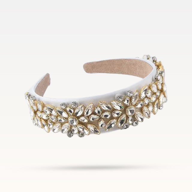 Enhance your style effortlessly with Hairband Flower Crystals - White by Margot Bardot, featuring exquisite white simulated pearls and shimmering rhinestones adorning its entire length.