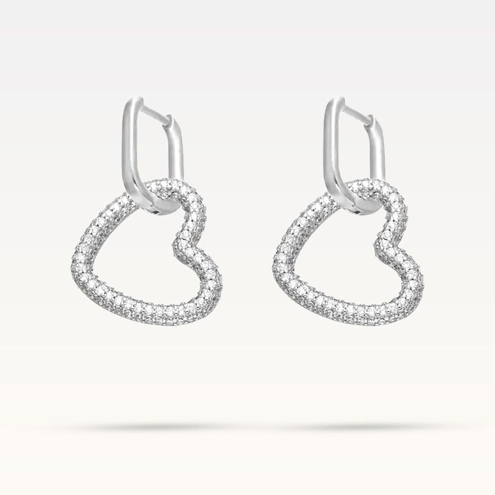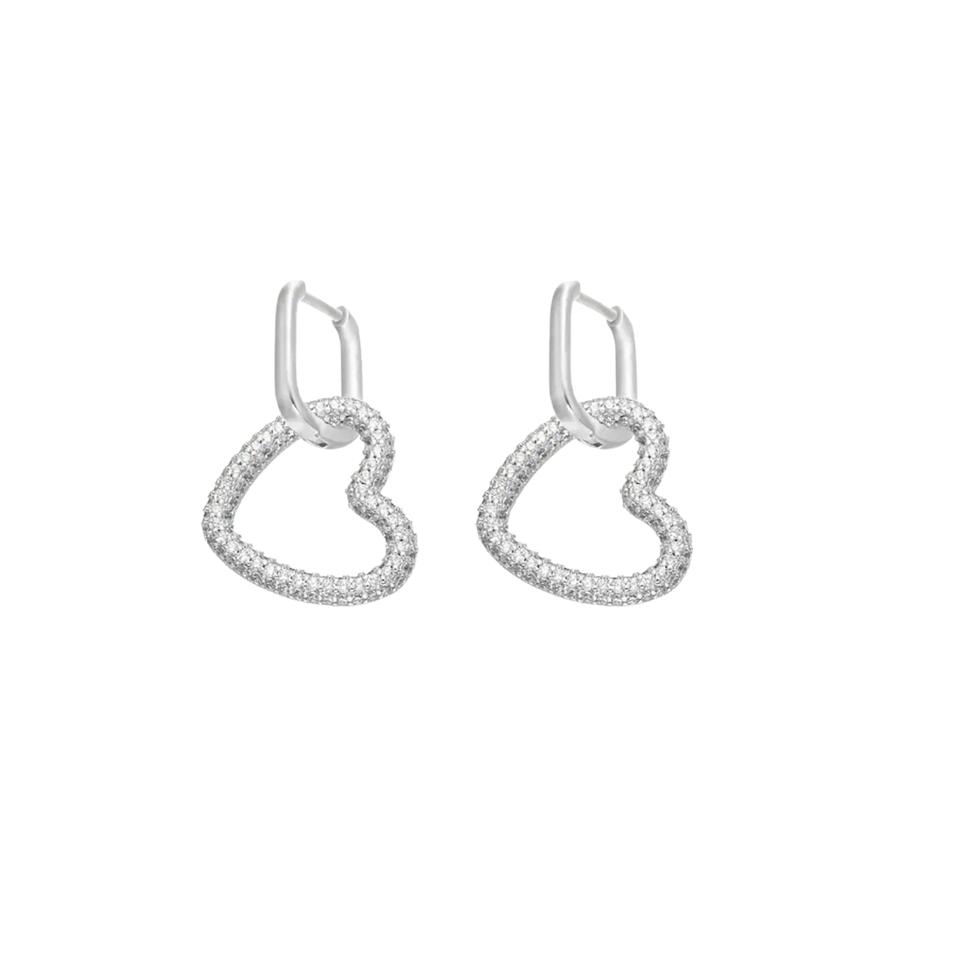 Margot Bardot's Ophelia Heart Earrings - Silver celebrate the spirit of love with every wear. Crafted from 18kt platinum-plated copper, these earrings feature a heart-shaped drop design adorned with vibrant, tiny crystals.