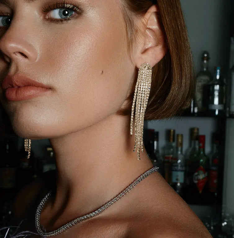 Crafted from high-quality Zinc Alloy and adorned with shimmering Rhinestones, these earrings feature a captivating chain fringe design that exudes glamour, perfect for elevating any outfit with a touch of sophisticated sparkle.
