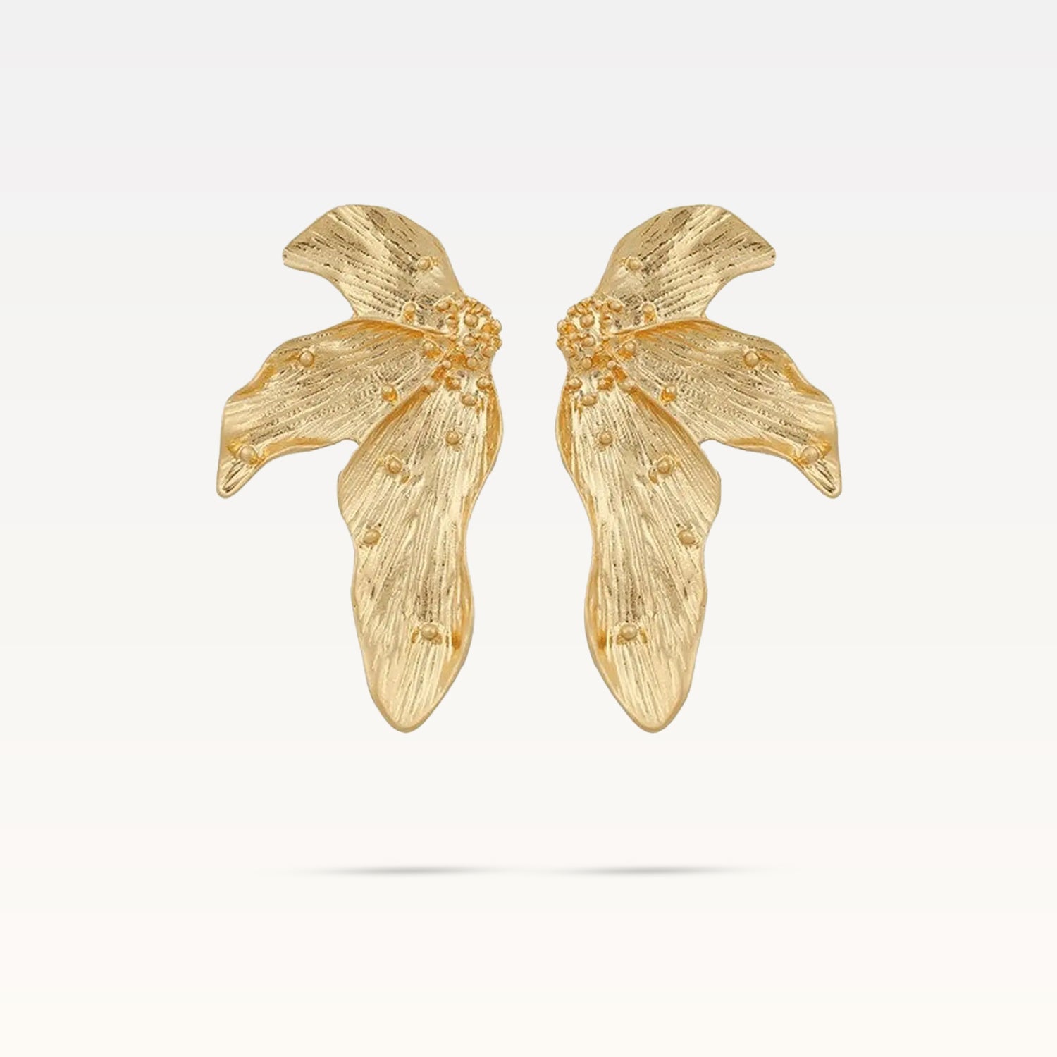 Look stunning and make heads turn with these beautiful earrings. Featuring a unique textured design and shaped like golden fairy wings. Charming and classic. Great for making a statement.