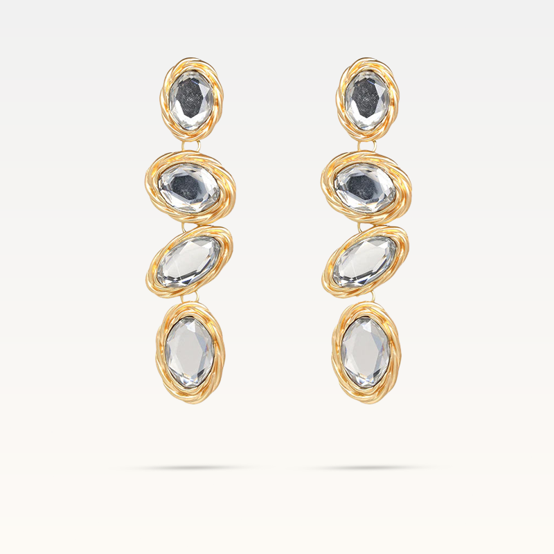 Elevate your style with Margot Bardot's Arya Earrings - White, designed to add a touch of elegance to your outfits. These drop earrings feature simulated rhinestones dangling intricately, creating a stunning look perfect for parties, date nights, or any occasion.