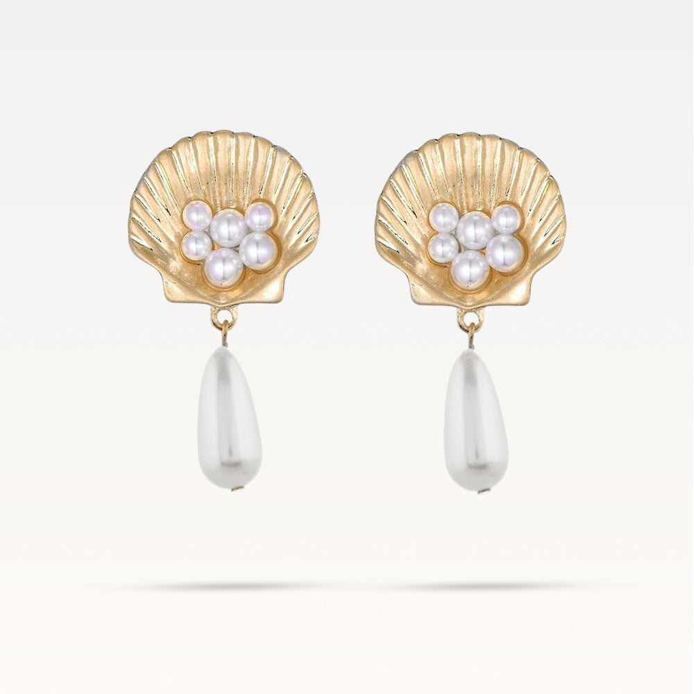 These elegant earrings feature six tiny pearls set in a golden shell and a big dangling pearl, perfect for adding a touch of class to any outfit. Crafted from nickel-free zinc alloy and simulated pearls, they measure 7.0 x 4.0 cm and weigh a comfortable 13.2g.