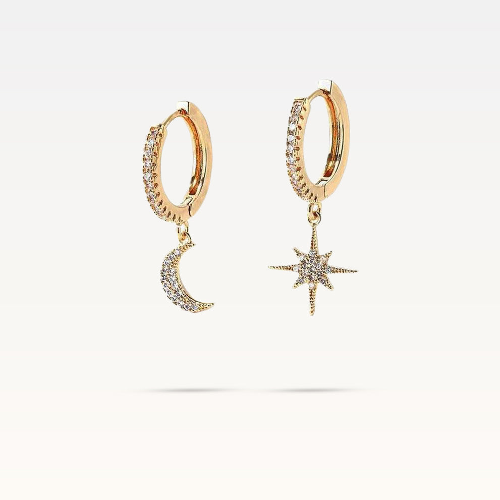 Illuminate your style with Margot Bardot's Celestial Huggie Hoop Earrings, shining brighter than the starry desert sky. These stylish gold earrings feature mismatched moon and star designs adorned with sparkling cubic zirconia gems, creating a fabulous celestial theme.
