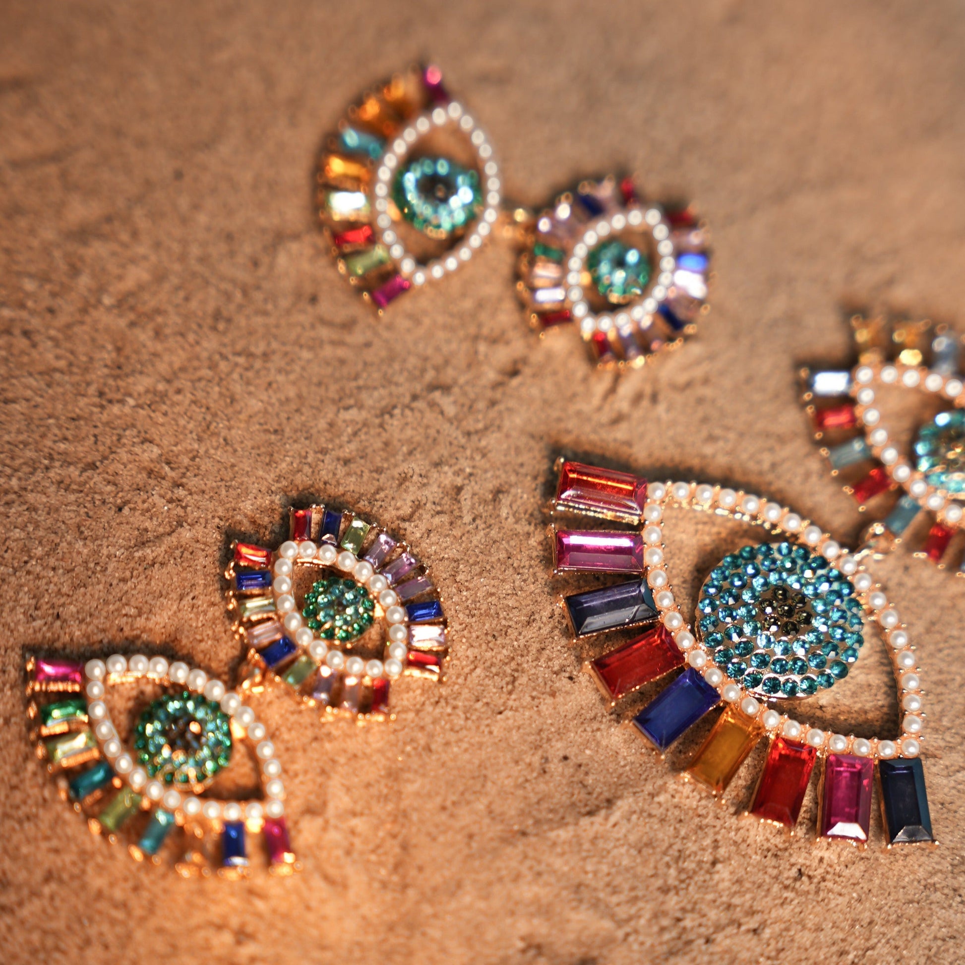 Make a stunning statement on every special occasion with Margot Bardot's Maeyu Eye Earrings - Multicolor. These exquisite earrings showcase a unique design with pastel-colored tiny pearls and colorful stones linked together to form a watchful eye motif.