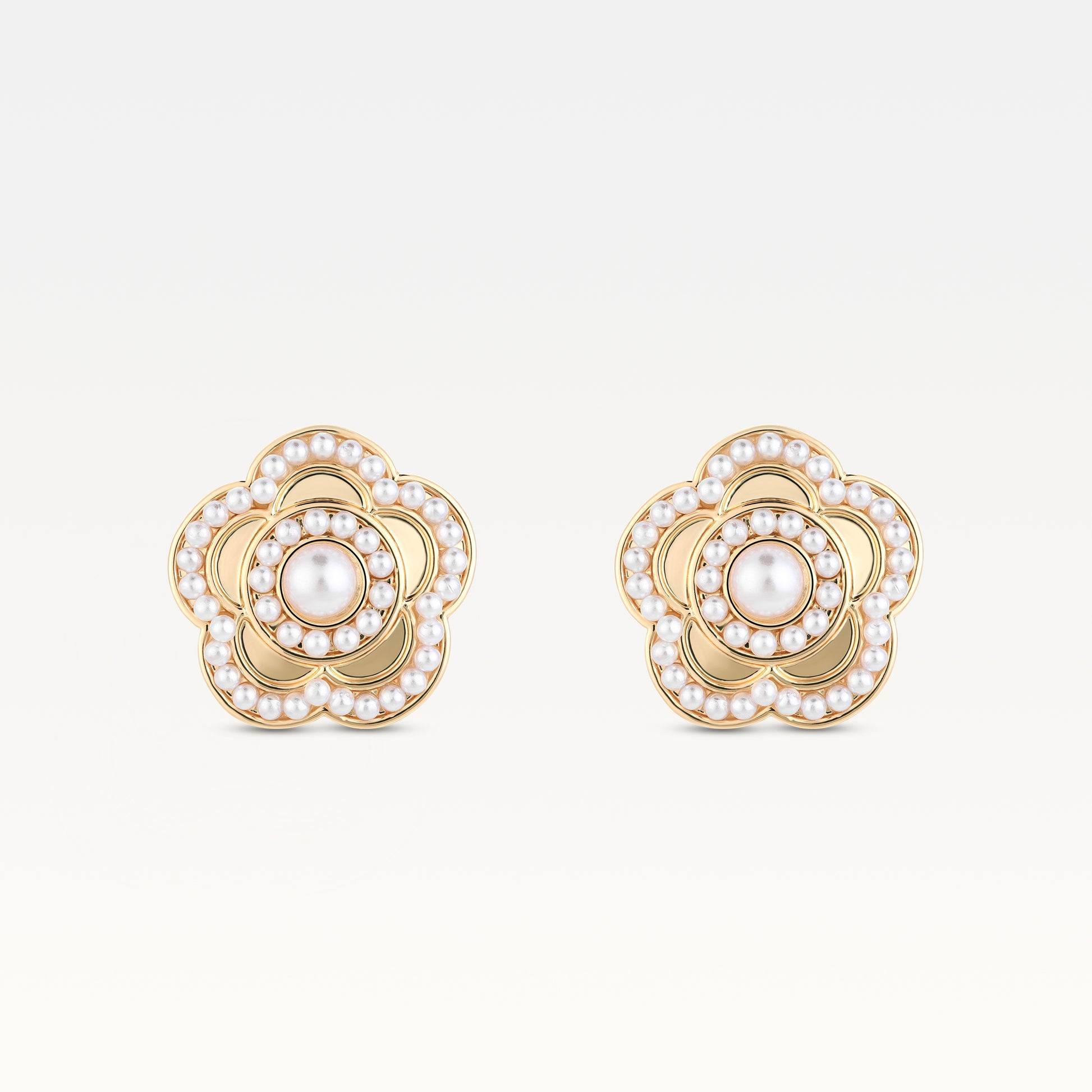 These statement floral studs feature beautifully layered enamel petals in a soft, radiant finish, blooming around a glowing imitation pearl center. A ring of delicate imitation pearls adds classic sophistication, while hand-set crystals shimmer subtly in the light, bringing a modern, luxurious twist to the traditional camellia motif. The entire piece is grounded in high-quality 18K gold-plated brass, offering lasting brilliance and durability.