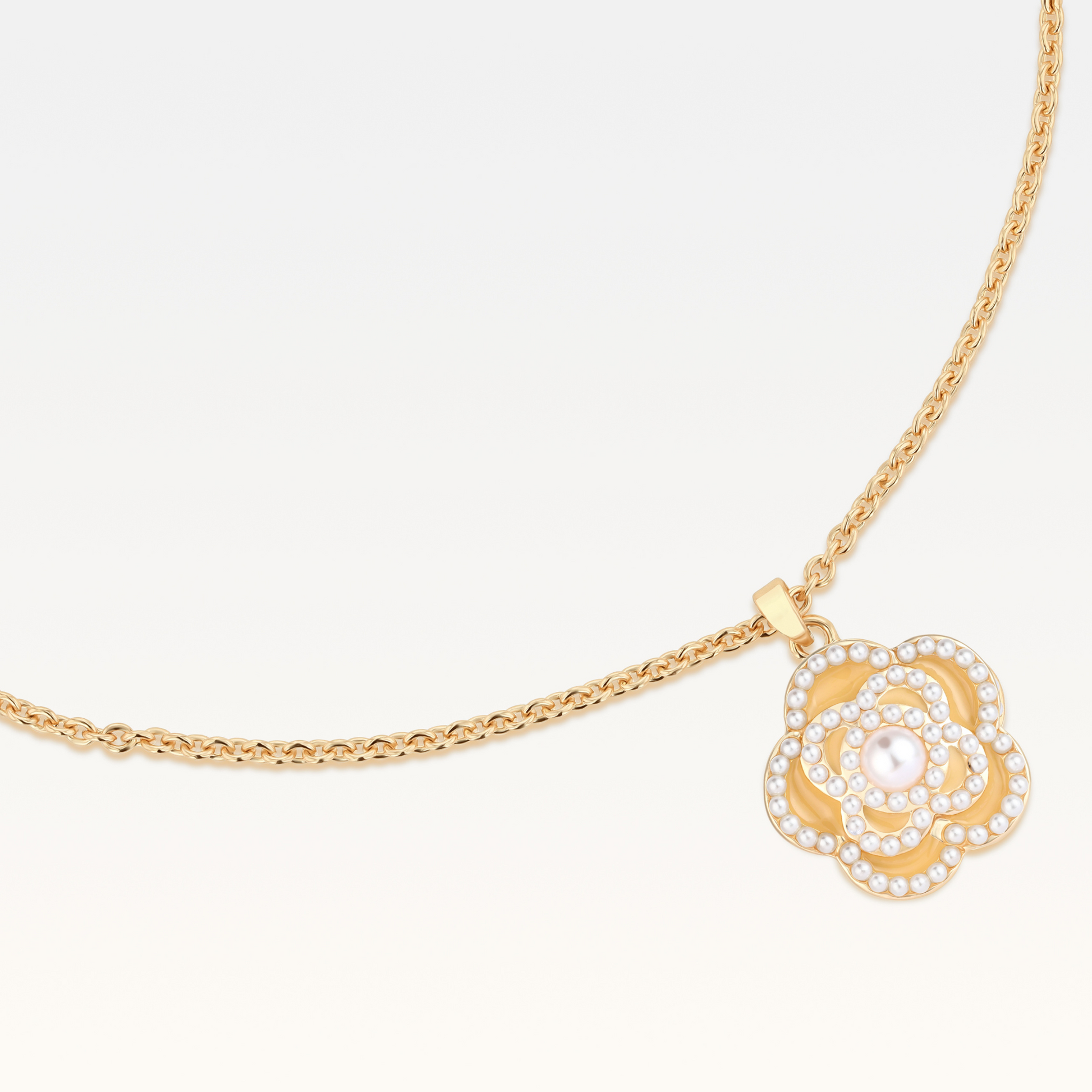 The intricate Camelia pendant adds a romantic yet bold touch to your ensemble, perfect for elevating both day and evening looks.