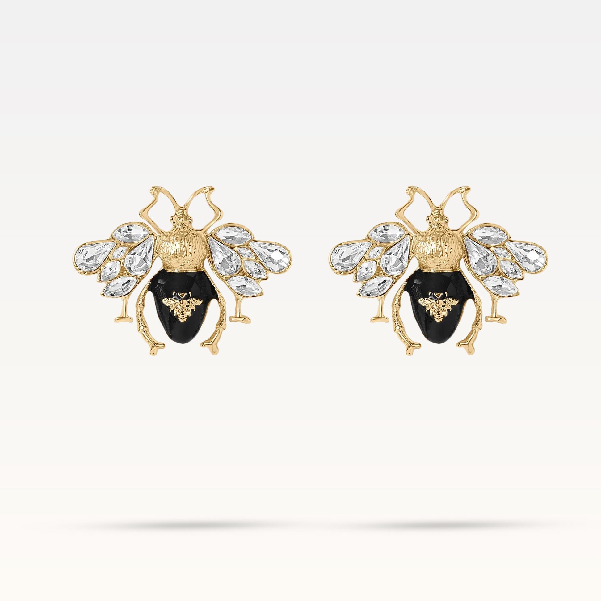 Elevate your style effortlessly with Margot Bardot's Robien Earrings - Gold. Crafted from nickel-free zinc alloy and adorned with tiny rhinestones, these earrings feature an intricate bee motif that adds charm and sophistication to any outfit.