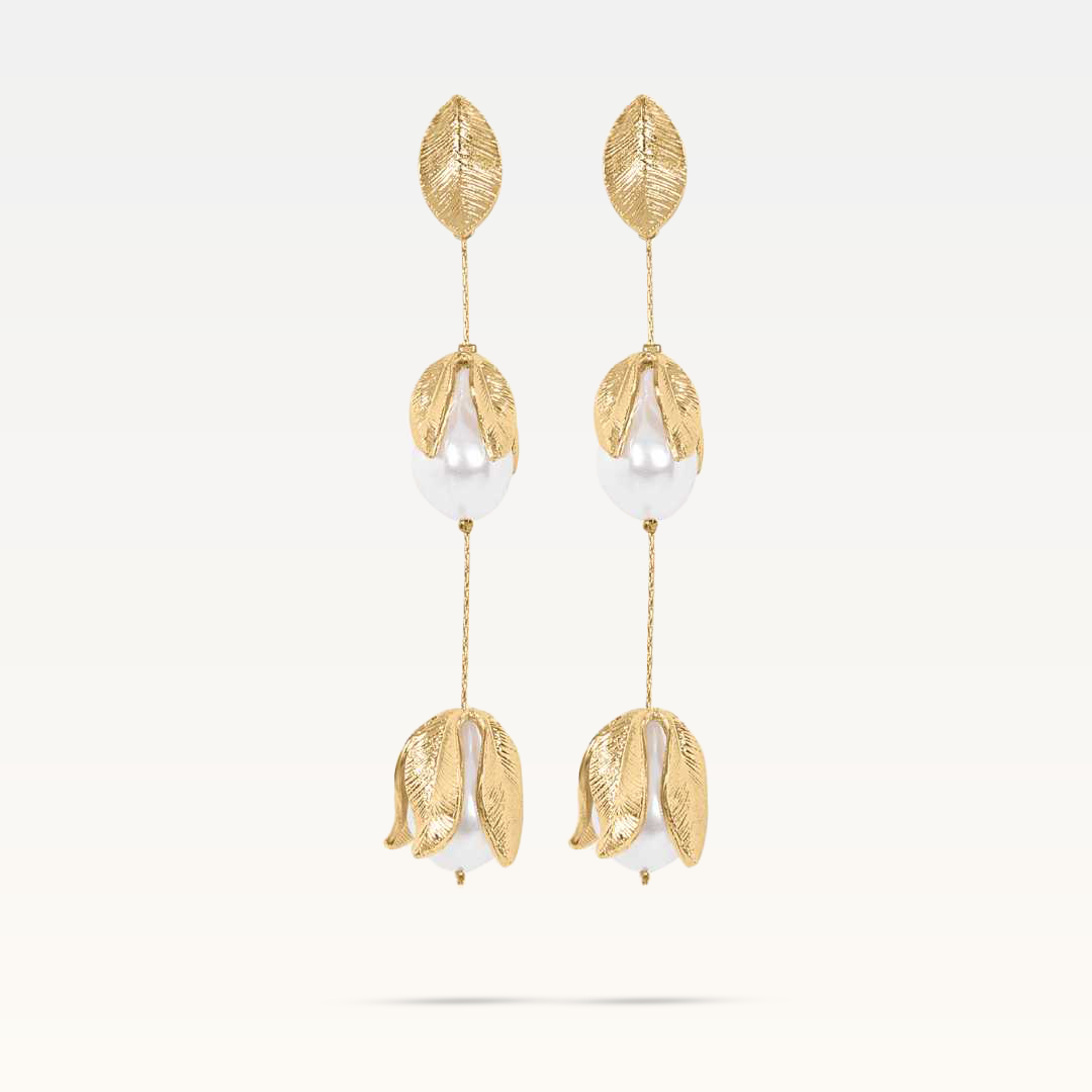 Crafted from nickel-free 14K gold-plated metal, these earrings feature delicate gold-tone petals adorned with glimmering polished pearls on a graceful drop chain. Measuring 10.5 x 1.7 cm and weighing a light 23.5g per pair, they are secured with a traditional pin anchoring system for easy wear.